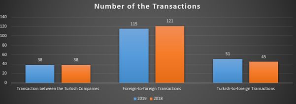 According to the categorization in terms of the origin of the transaction parties, number of transactions which were realized solely between the Turkish companies in 2019 was 38, same with 2018. As shown from the figure below, however, there was a slight decrease in the number of foreign-to-foreign transactions notified to the TCA in 2019 when compared to 2018; the number of foreign-to-foreign transactions notified to the TCA was 115 in 2019 while the corresponding number in 2018 was 121. On the other hand, transactions between Turkish and foreign companies were 51 in 2019 (compared to 45 such transactions in 2018).