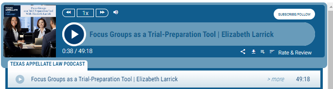 Preparation is the key to winning at trial, and focus groups are a powerful tool for ensuring that a case is trial-ready. In this episode of the Texas Appellate Law Podcast, hosts Todd Smith and Jody Sanders visit with Austin-based trial lawyer and consultant Elizabeth Larrick of the Larrick Law Firm. Elizabeth shares her passion for helping lawyers prepare for trial using focus groups and jury feedback, detailing her journey from practicing personal injury law to becoming a trial consultant. Tune in to learn how focus groups can enhance trial readiness and help lead to successful outcomes.